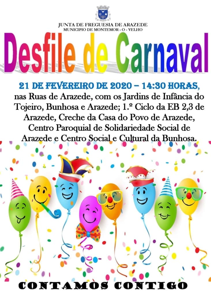 21 de fevereiro de 2020 – 14:30 horas, nas Ruas de Arazede, com os Jardins de Infância do Tojeiro, Bunhosa e Arazede; 1.º Ciclo da EB 2,3 de Arazede, Creche da Casa do Povo de Arazede, Centro Paroquial de Solidariedade Social de Arazede e Centro Social e Cultural da Bunhosa